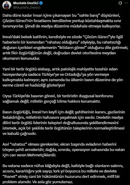 Destici, sosyal medya hesabından yaptığı açıklamada şu ifadeleri kullandı: “Daha düne kadar insan içine çıkamayan bu “sahte barış” düşkünleri, Çözüm Süreci’nin fırsatlarını kendilerine yontup küstahlaşmakta sınır tanımıyorlar. Şimdi de medya düzenine müdahale etmeye kalkıyorlar. İmralı’daki bebek katilinin, kendisiyle ve sözde “Çözüm Süreci”yle ilgili haberlerin bir kısmından “rahatsız olduğunu” söyleyip, bu rahatsızlığı doğuran içerikleri engellemenin “iktidarın görevi” olduğunu dile getirmek; artık fikir özgürlüğünün değil, doğrudan devlet otoritesine meydan okumanın konusudur.