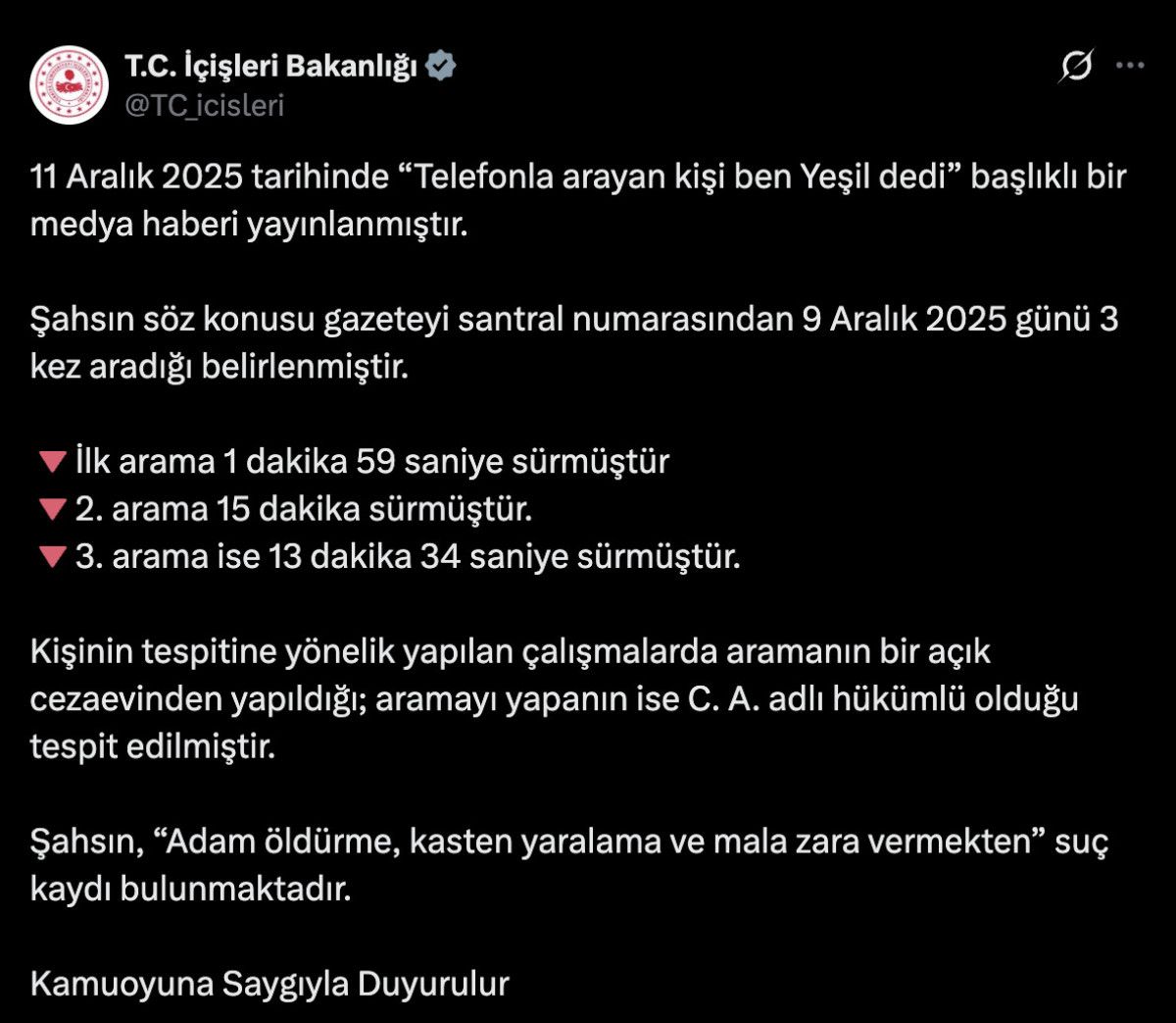 Şahsın söz konusu gazeteyi santral numarasından 9 Aralık 2025 günü 3 kez aradığı belirlenmiştir.
