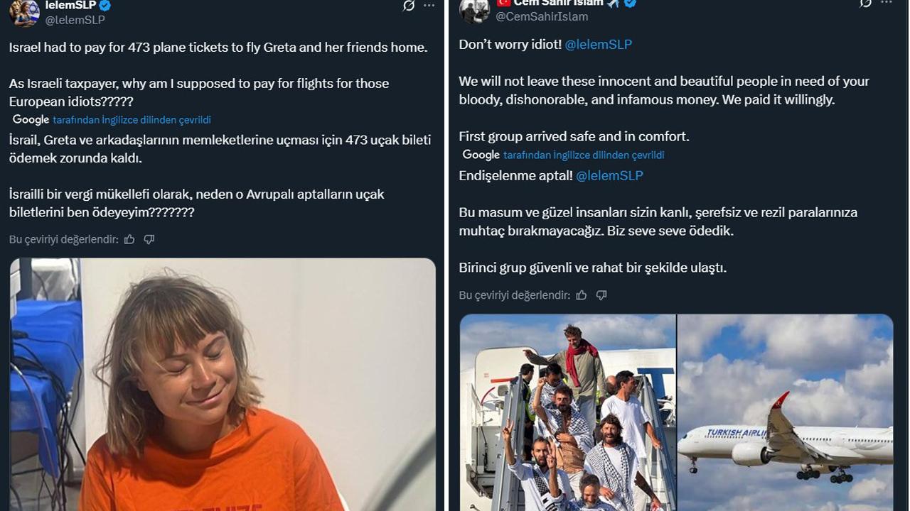 Twitter’da İsrail yanlısı hesaplar, Greta Thunberg’in fotoğrafını paylaşarak Sumud filosuna katılan aktivistlerin uçak biletleri ücretlerini sorguladı. İsrail destekçisi hesaplardan yapılan paylaşımlarda, “İsrail, Greta ve arkadaşlarının ülkelerine dönmesi için 473 uçak bileti ödemek zorunda kaldı. Neden ben, İsrailli bir vergi mükellefi olarak, bu Avrupalıların biletlerini ödeyeyim?” şeklinde ifadeler yer aldı.